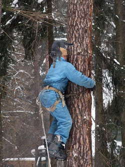 Человек, используя приспособления для альпинизма - кошки, спасает кошку.