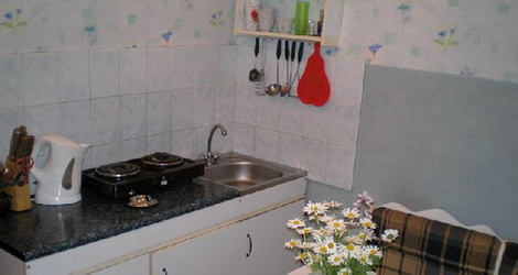 Кухня отделана плиткой, и на столе стоит тоже плитка.