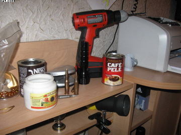 Патроны от автомата на полке, патрон в шуруповерте, и патрон для лампочки в светильнике.